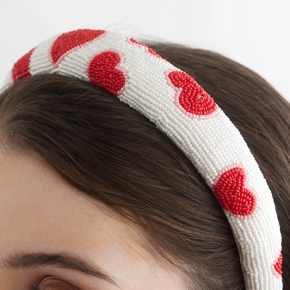 Enter the world of romance with the Paris headband, a whimsical accessory that captures the spirit of the City of Love. Delicately beaded with love hearts in shades of white, red, and a touch of pink, this headband is a heartfelt homage to the romantic essence of Paris.